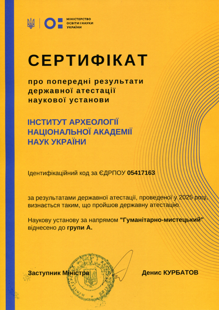 Відповідно до Закону України «Про наукову і науково-технічну діяльність», Порядку проведення державної атестації наукових установ, затвердженого постановою Кабінету Міністрів України від 19 липня 2017 р. № 540 та наказу Міністерства освіти і науки України від 28.11.2024 № 1675 «Про забезпечення організації та проведення у 2024-2025 роках державної атестації наукових установ та закладів вищої освіти в частині провадження такими закладами наукової та науково-технічної діяльності» Інститут археології Національної академії наук України впродовж 2025 року проходив державну атестацію.