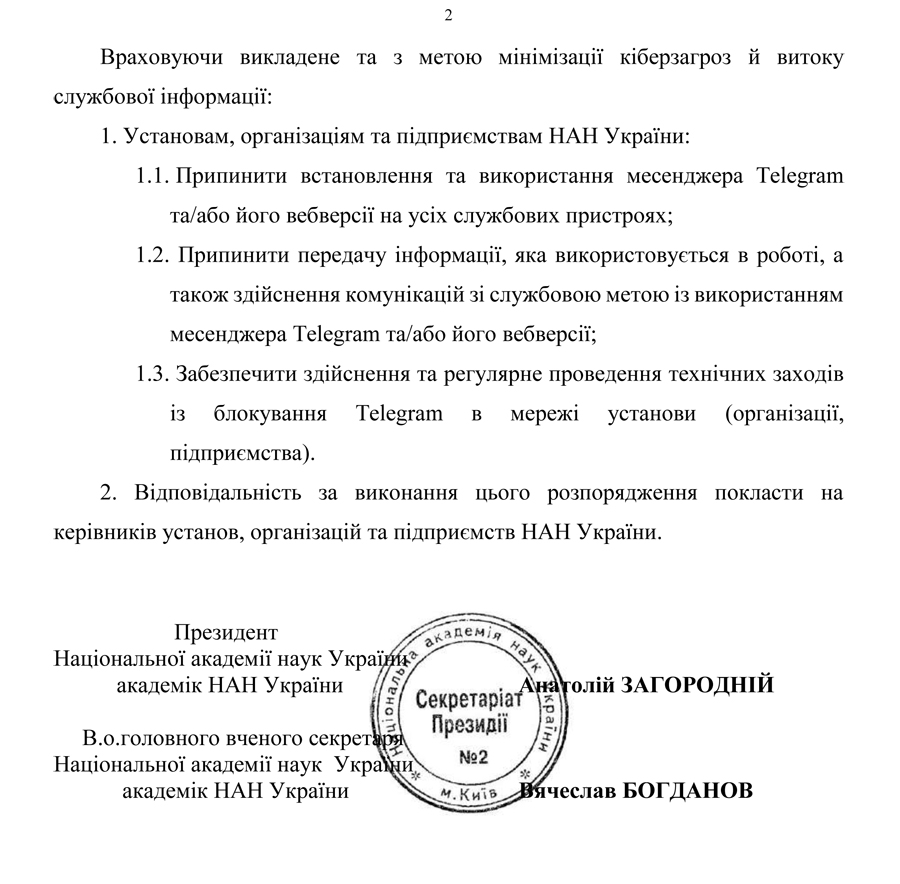 Розпорядження Президії НАН України "Щодо мінімізації кіберзагроз та витоку службової інформації в установах, організаціях та підприємствах НАН України"