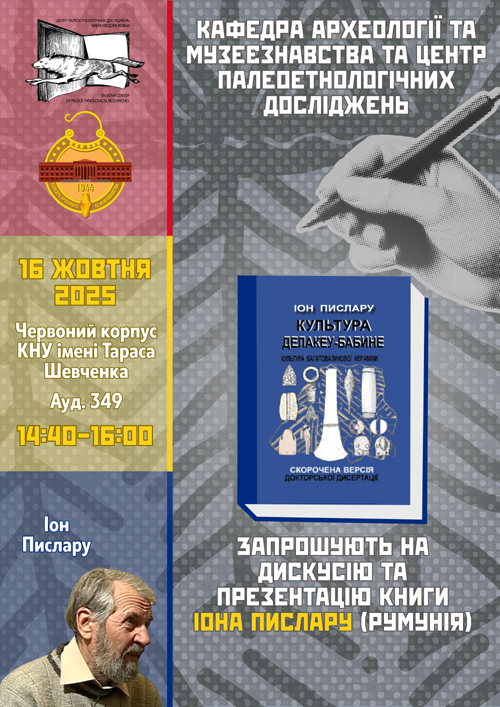Кафедра археології та музеєзнавства КНУ та Центр палеоетнологічних досліджень запрошують на дискусію та презентацію монографії Іона Пислару (Румунія) "Культура Делакеу-Бабине", які відбудуться 16 жовтня 2025 року о 14-40 в ауд. 349 Червоного корпусу КНУ ім. Тараса Шевченка.